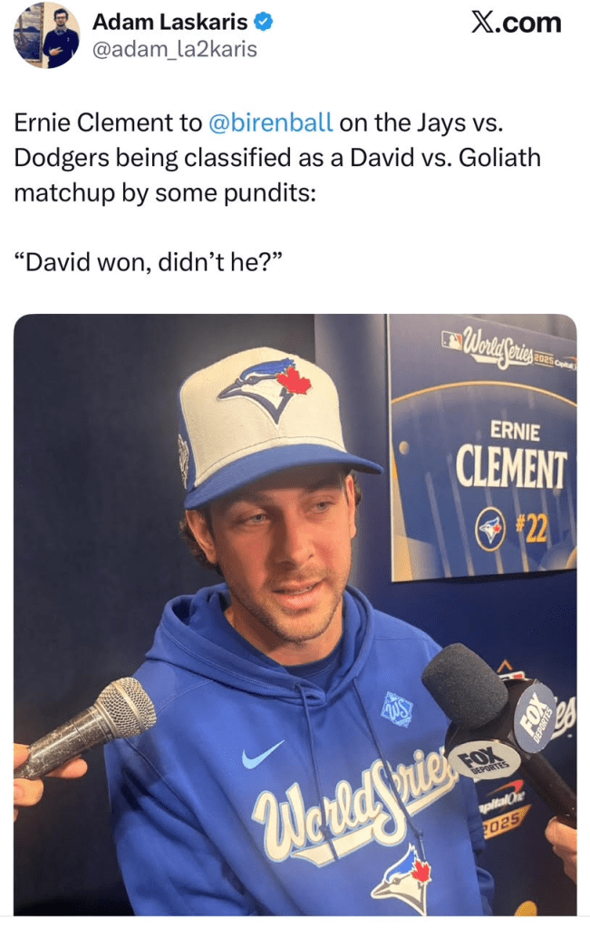 In the opening round against the ‘evil empire’ New York Yankees (who most experts predicted would beats Toronto) one of the Yankees TV talking heads said about Ernie: “nobody’s ever heard of this guy.”. Clement just kept swinging. This guy became The Guy.