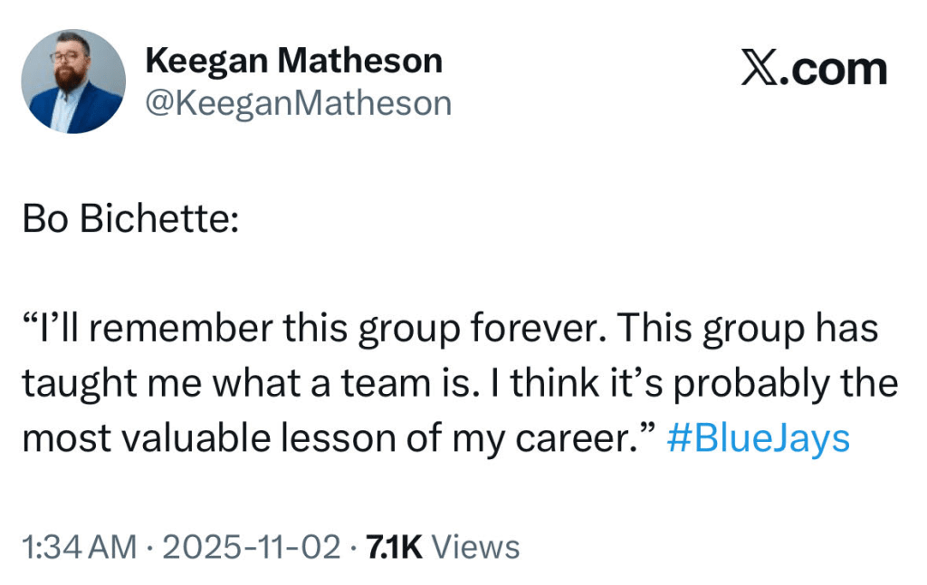 The 2025 Toronto Blue Jays offered us more than an inspiring last-to-first improbable run that fell just one bounce, one inch (or centimeter, or pitch, or hit) short of glory. They also offered us models of manhood and being better teammates to one another in moments of crushing defeat as well as collective success.