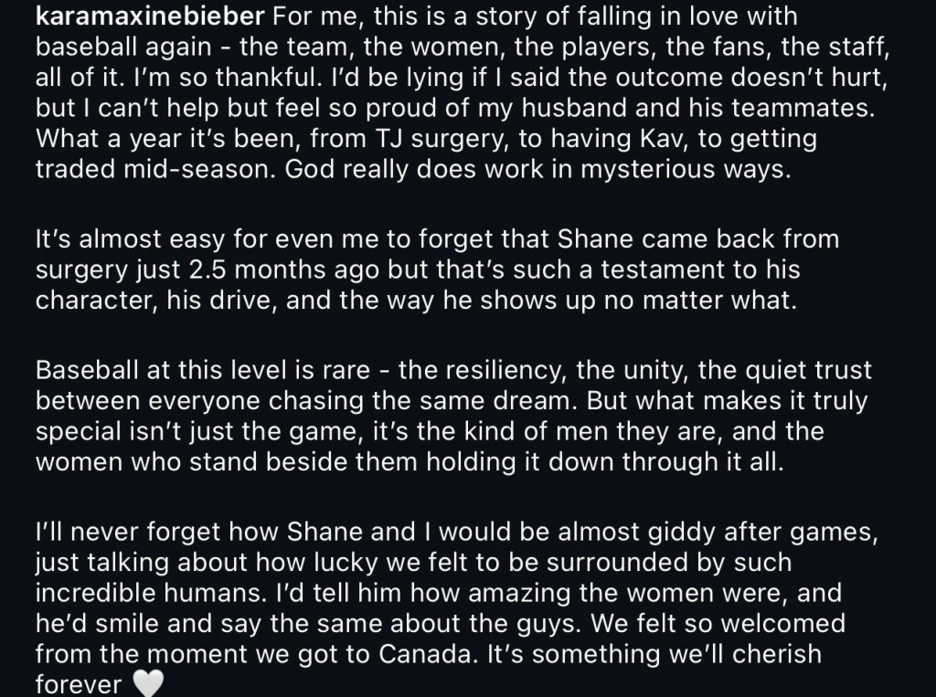 A testament to the workplace, the team culture, and community they created together not only as players but also staff as well as family and their loved ones was this post by Kara Bieber, wife of Jays pitcher Shane Bieber.