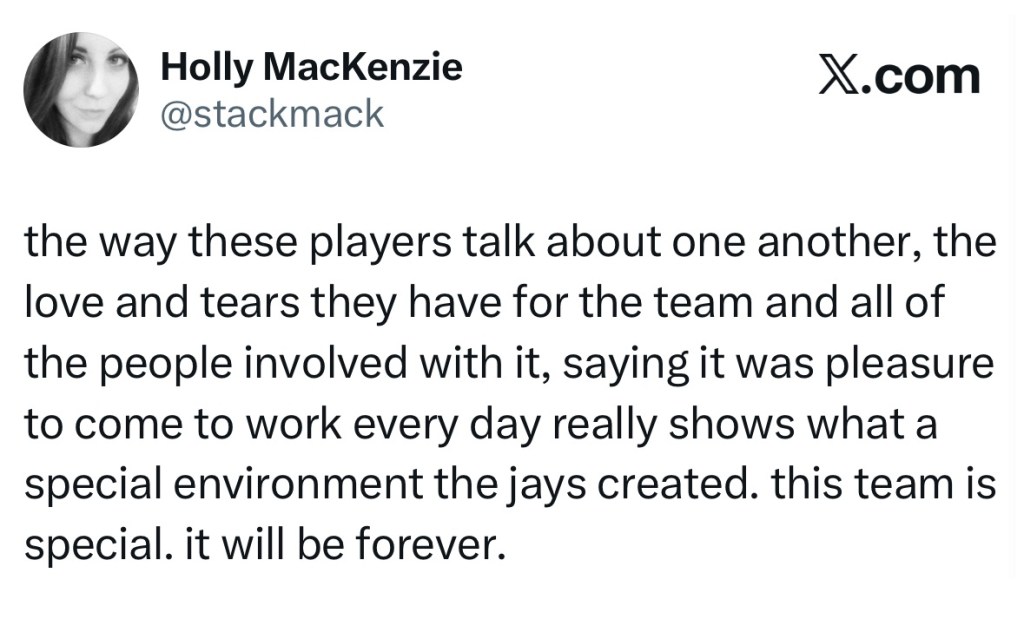 Sportsnet’s Blue Jays in-game reporter Hazel Mae described Clement as one of the most positive people she’s ever seen in the game, whether he goes hitless or hits a home run. I think of Vladdy dancing in the dugout whether he was doing well or struggling. Hearing stories of – after stinging defeats – the Jays doing what they always do win or lose: go right into the locker room and rather than sit alone in silence, would put some music on and started playing cards together. It’s not because they didn’t care enough, it’s the opposite. They cared a LOT. They knew the best way to deal with defeat or a loss is to be in community, sit together and talk about it, but also turn the page and keep moving forward. That’s the workplace culture they created.