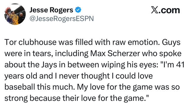 “They moved softly across the room, hugging one another, thanking one another, exchanging that quiet moment of eye contact that either says “I love you” or “I’ll see you soon.” …Chris Bassitt, set to be a free agent at 36, stood at his locker and turned slowly, sensing the cameras waiting behind him, but his manager cut in to stop him. Before the questions started, John Schneider said he needed one more moment with his pitcher.