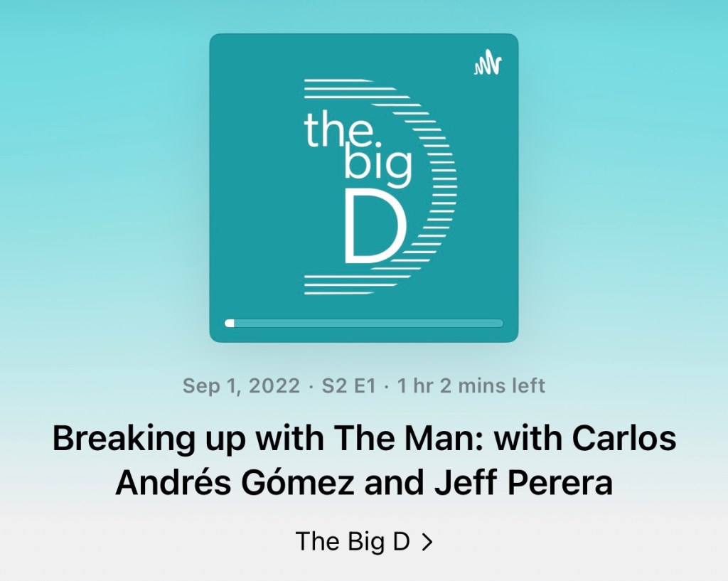 Carlos Andrés Gómez and Jeff Perera join The Big D podcast to “talk about helpful and unhelpful ideas of manhood and how they influence relationships. And of course, breakups. These unhelpful ideas of masculinity are not intrinsic to men or masculine people. So we talk a lot about character and qualities, what underpins gut reactions, and how we can do things differently. Together, Carlos and Jeff are the perfect messengers… This episode is loaded with sweet metaphors, laughs, and mic drops…”